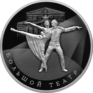 – монеты номиналом 25 рублей расположено рельефное изображение танцующей балетной пары на фоне изображений здания Большого театра и света софитов, выполненных в технике лазерного матирования; внизу по окружности – надпись: «БОЛЬШОЙ ТЕАТР».