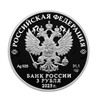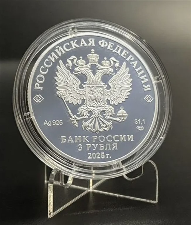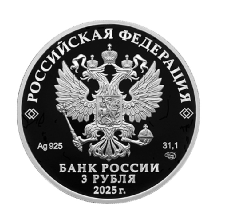 На лицевой стороне монеты расположено рельефное изображение Государственного герба Российской Федерации, имеются надписи: «РОССИЙСКАЯ ФЕДЕРАЦИЯ», «БАНК РОССИИ», номинал монеты «3 РУБЛЯ», год выпуска «2025 г.», обозначение металла по Периодической системе элементов Д.И. Менделеева, проба сплава, товарный знак Санкт-Петербургского монетного двора и масса драгоценного металла в чистоте.