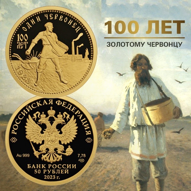 Однако для оборота выпускали не только бумажные деньги. С 1923 года на Петроградском монетном дворе начали выпускать золотые монеты-червонцы, которые по своим параметрам повторяли царские 10 рублей. Их дизайн был разработан медальером Антоном Васютинским на основе эскиза для одной из дореволюционных сельскохозяйственных выставок. На монете в полный рост изображен крестьянин-сеятель на фоне дымящихся труб, плуга и восходящего солнца. Золотых червонцев, датированных 1923 годом, было выпущено чуть более 2,7 млн штук.